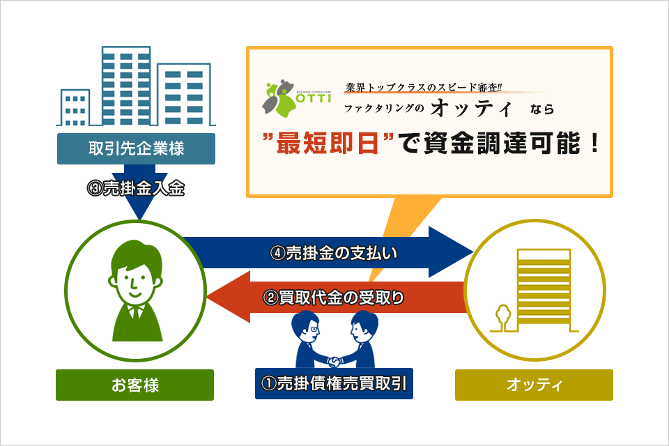 個人事業主は、売掛債権額が低い事・エビデンスが不十分であるケースが多い事等を理由に条件を下げられる又は断られてしまう場合があります。オッティでは豊富な実績を生かし、個人事業主が有する債権であっても柔軟に買取対応しており、法人格の有無に関わらず幅広い企業で利用する事が可能です。もちろん、公式ページでも最上部に個人事業主も対象にしている旨を明記しており、創業間もない会社や実績のない個人事業主でも売掛先の信頼性さえ高ければ利用が出来る点で緊急時の総合サポートとしての活用も少なくありません。なお、民間ファクタリング会社特有の“売掛先の信用性を重視した審査”で行うノンリコースファクタリングを得意にしているため、万が一売掛債権が回収不能に陥ってしまっても、利用企業へ代わりに請求されるという心配もありません。そのため、「無限責任」である個人事業主の方でも安心して利用する事が可能です。